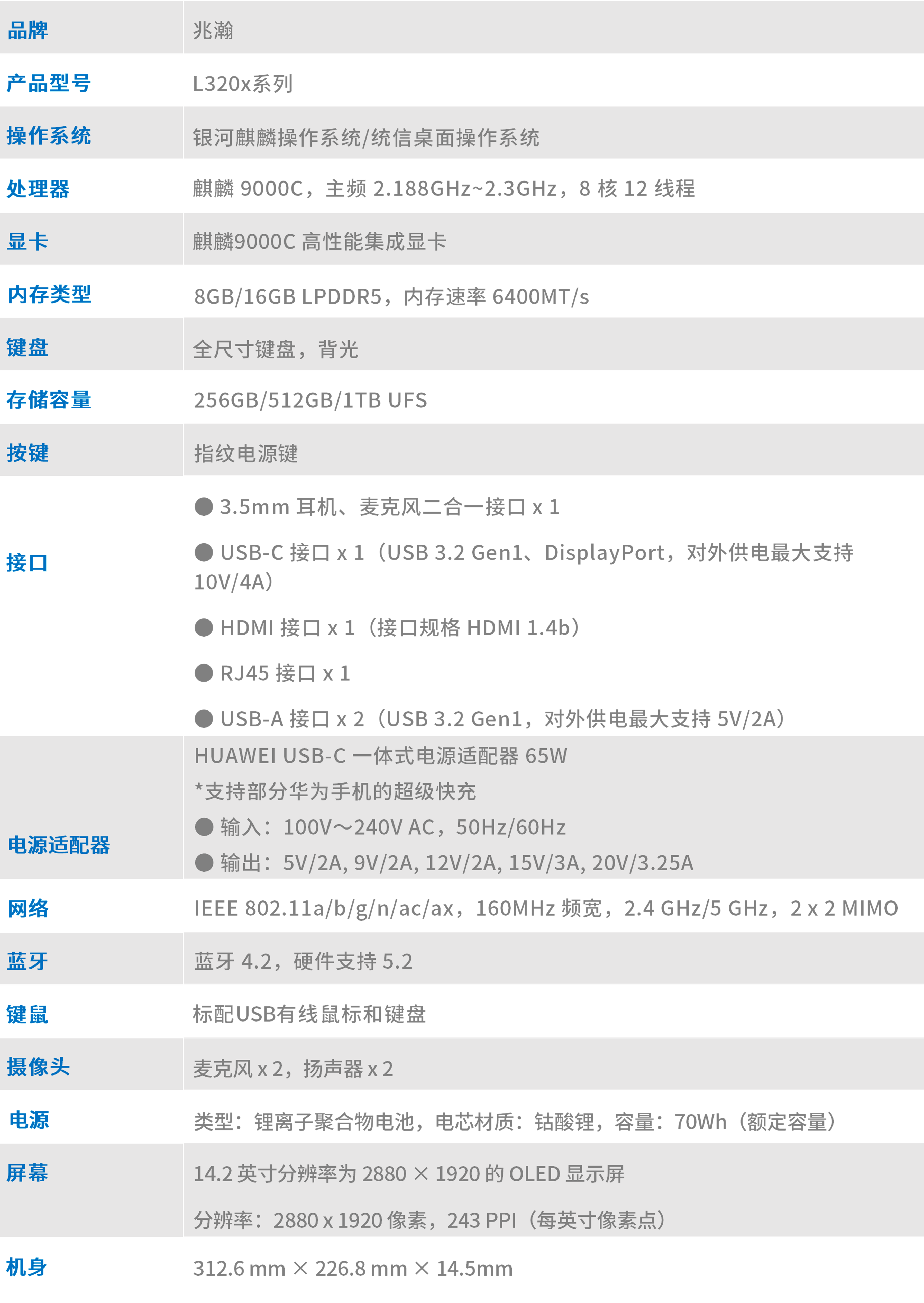 兆瀚 L320x 系列笔记本采用华为8核12线程桌面旗舰处理器麒麟 9000C,搭载 UOS/KOS 国产操作系统的 14.2英寸高性能旗舰商务笔记本。采用金属外壳设计,彰显品质;厚度薄至 14.5mm,重量轻至 1.32kg,轻薄便携。 采用 2880x1920 像素分辨率 OLED 屏幕,屏占比 91%,支持 P3、sRGB、Adobe RGB 多色域切换,最高 120Hz刷新率,亮度高达 450 尼特(典型值);配有 1080P 高清前置摄像头;是您日常办公和商务旅行的智能助手。