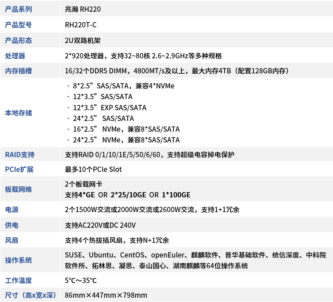 兆瀚RH220T-C高性能服务器兆瀚RH220T-C高性能服务器是基于华为鲲鹏920处理器的2U2路机架式高性能服务器,该服务器面向互联网、HPC、金融、运营商、政企、分布式存储、云计算、大数据等领域,具有高性能、高安全、高可靠、高效运维、高能效、大容量存储等优点,适合为企业应用提供高并发的多核算力。
