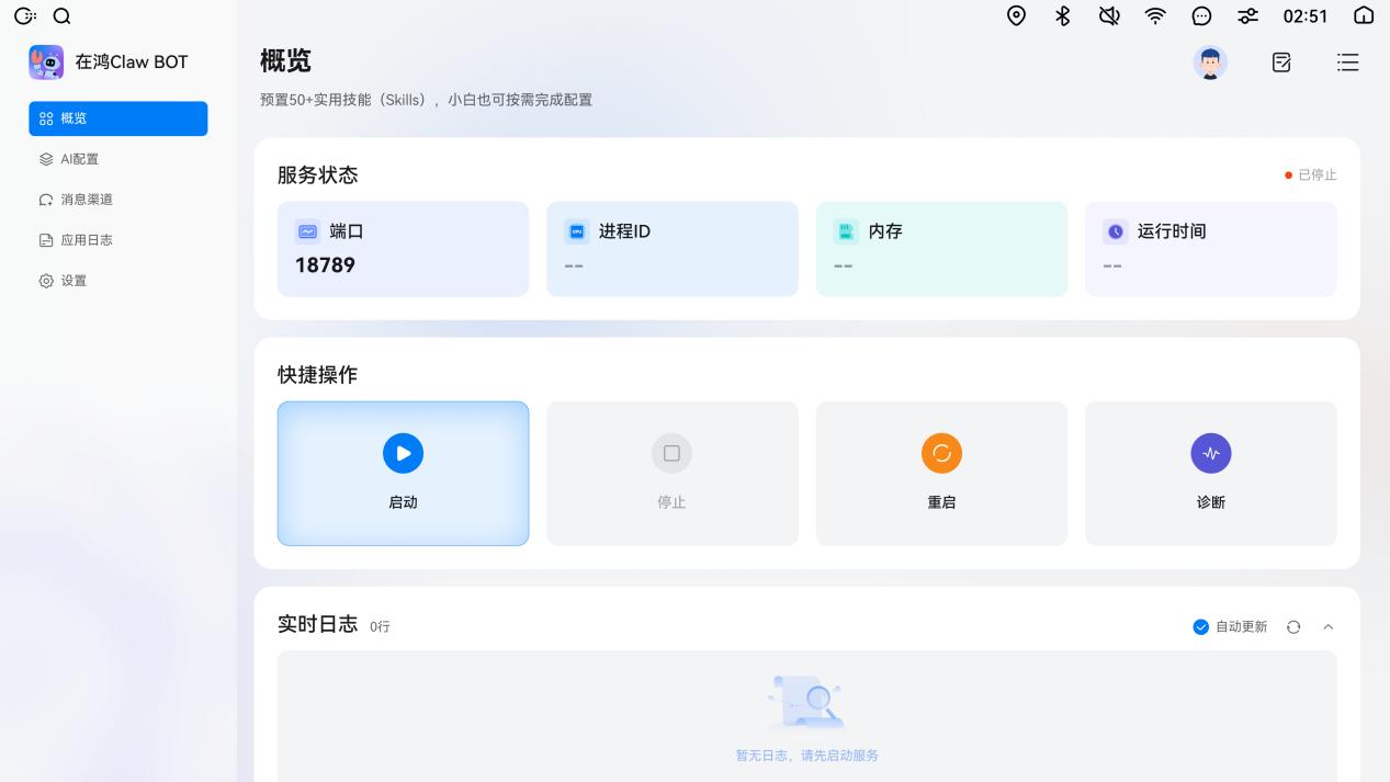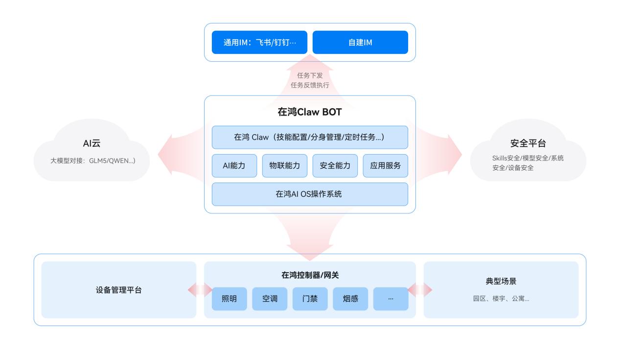 在鸿Claw BOT最大的产品特色在于“开箱即用”的便捷性,有效打破传统 IoT 方案的配置壁垒。产品内置设备联动、能耗分析、告警提醒等多款空间设备适配技能,用户无需专业配置即可直接选用;云端已完成多款主流大模型的提前对接,用户可按需灵活选择,实现 AI 能力零门槛调用。